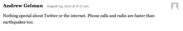 A few days ago, I wrote (with Alan Mislove) about our TweetQuake visualization (read the relevant post here). Some of the commenters pointed out that it’s not really surprising that tweets travel faster than earthquakes. Here’s Andrew Gelman (I don’t know if it’s that famous Andrew Gelman, but I think so) commenting on The Monkey Cage Blog: