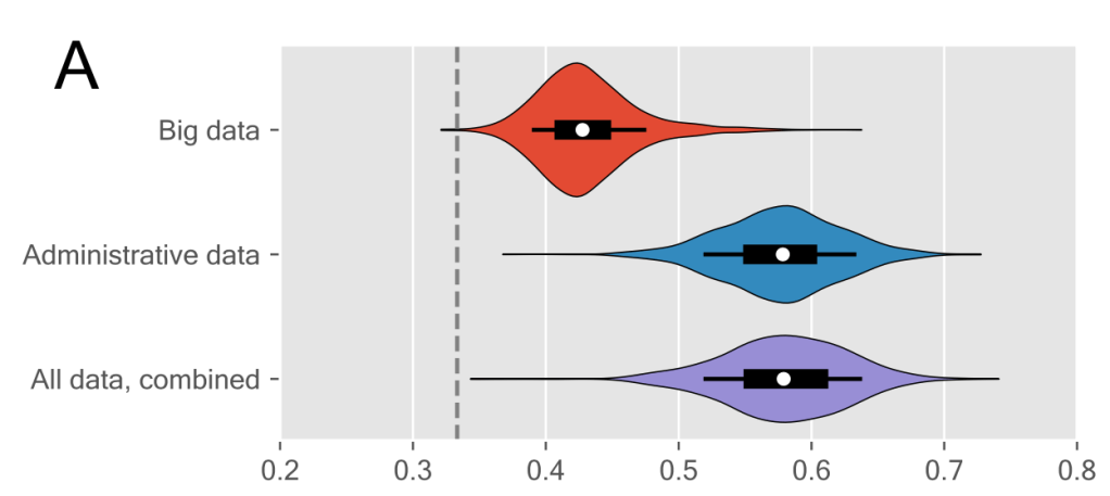 The top line of the figure (red violin) shows the performance of behavioral data alone, the second line (blue violin) shows administrative data alone, and the bottom line shows performance when both data-types are combined. As is clear from the plot: When comparing behavioral data with the registry data head-to-head, we clearly get the best prediction from the administrative alone. And when we combine the two, the behavioral data does not add any additional information!