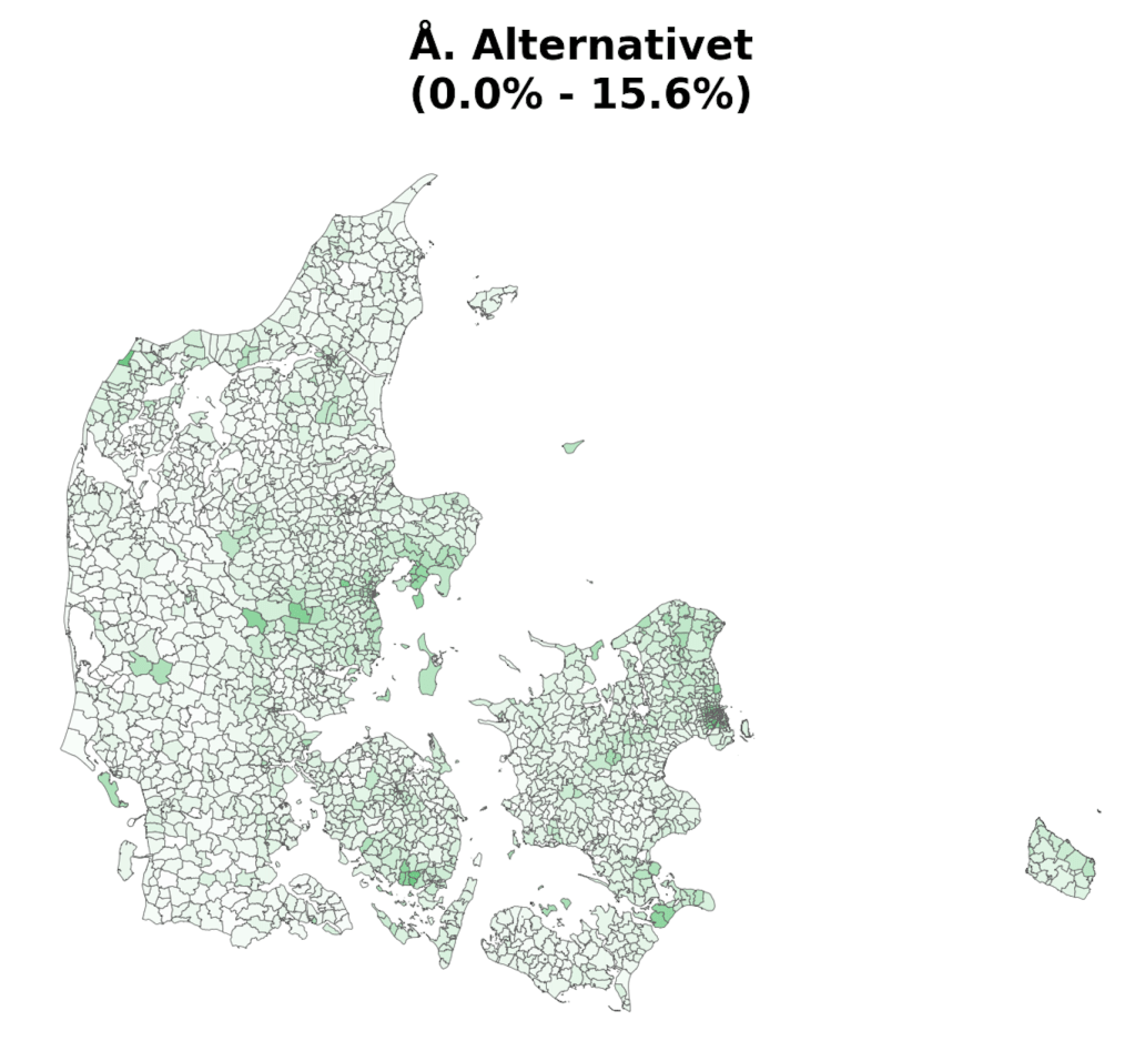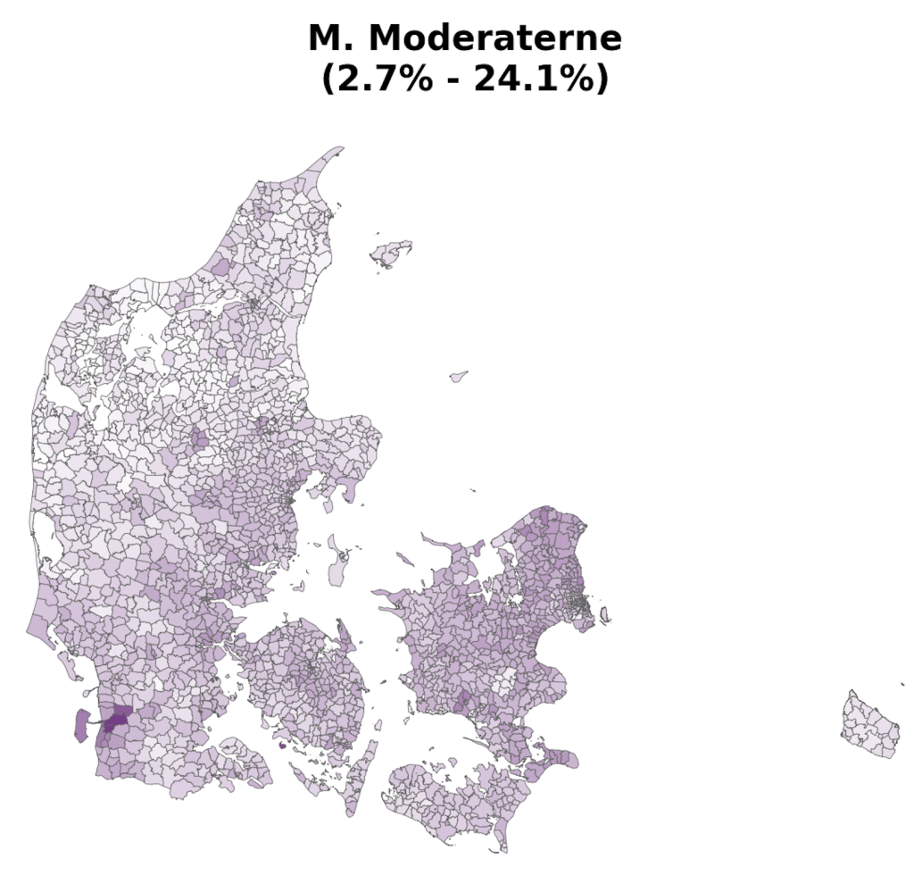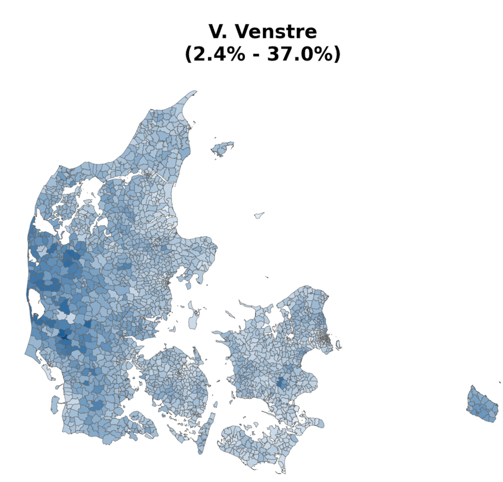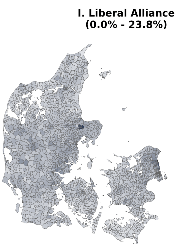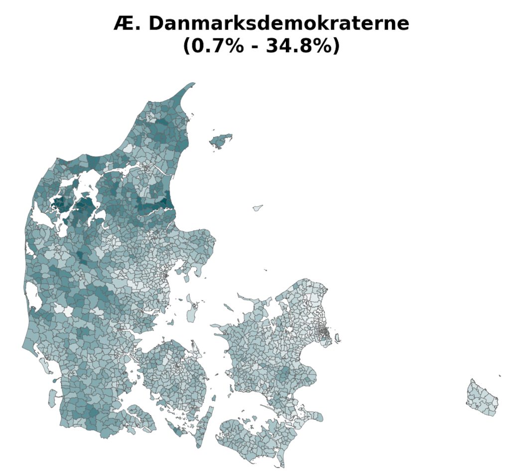As part of a project on something completely different, the always brilliant Louis Boucherie generated these maps of voting in Denmark during the 2022 general election [1]. Maybe it’s me, but I can’t remember seeing voting at this resolution (parishes [2]) and I found resulting images surprisingly neat & interesting, so thought it was worth a post.