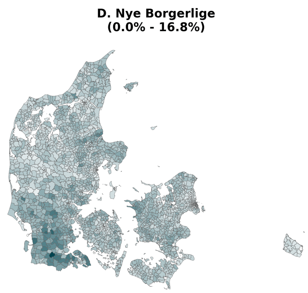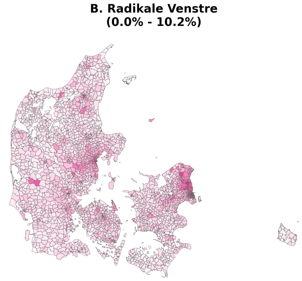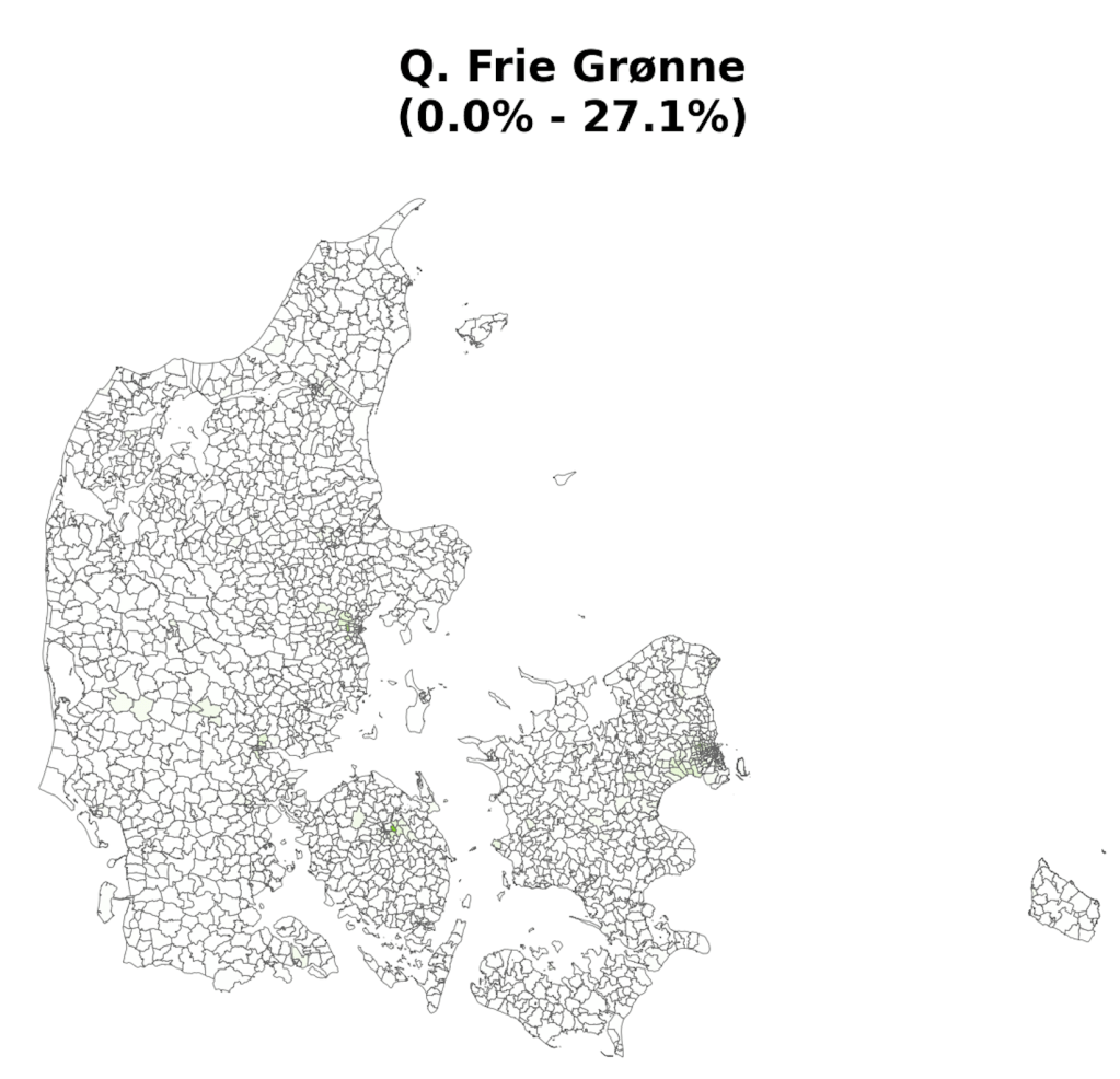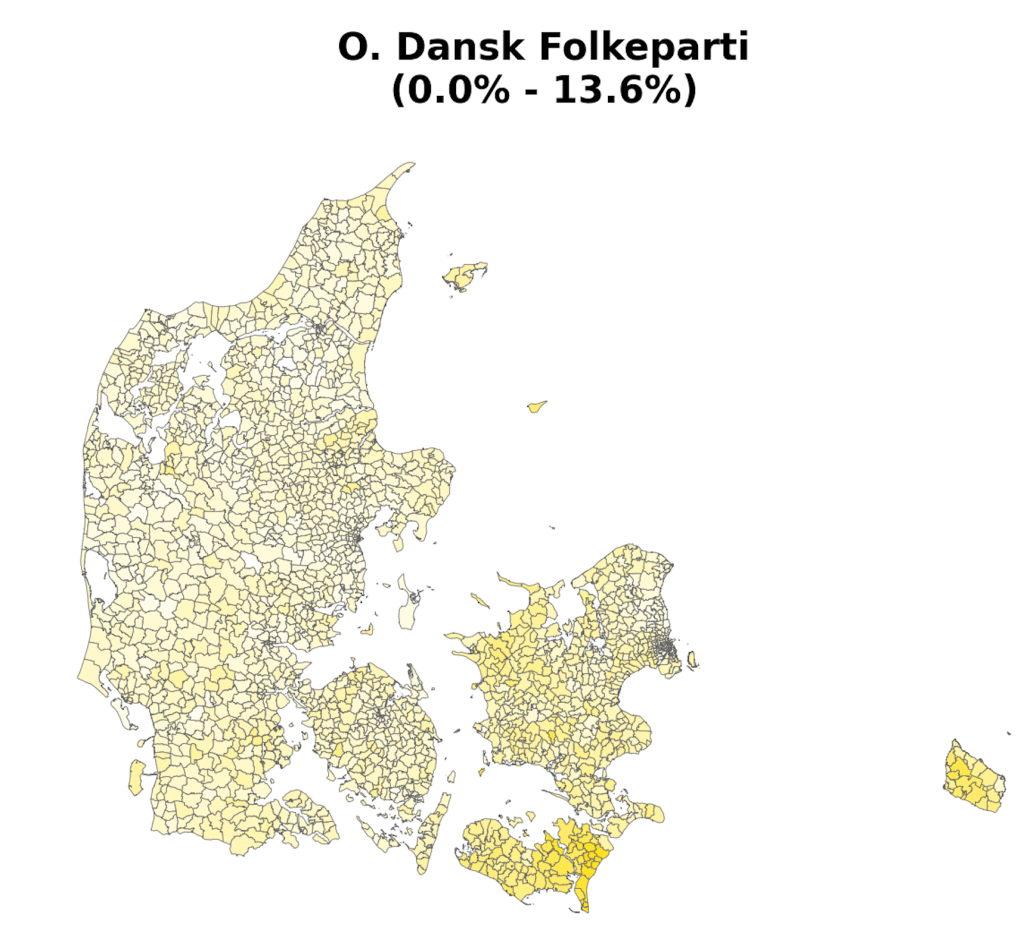 As part of a project on something completely different, the always brilliant Louis Boucherie generated these maps of voting in Denmark during the 2022 general election [1]. Maybe it’s me, but I can’t remember seeing voting at this resolution (parishes [2]) and I found resulting images surprisingly neat & interesting, so thought it was worth a post.