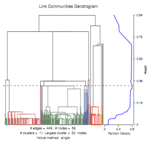 In addition, there are many neat features. For example, linkcomm allows you to visualize sub-communities by themselves. Alex has also published an Application Note in Bioinformatics about the implementation, so take a look if you’re interested: