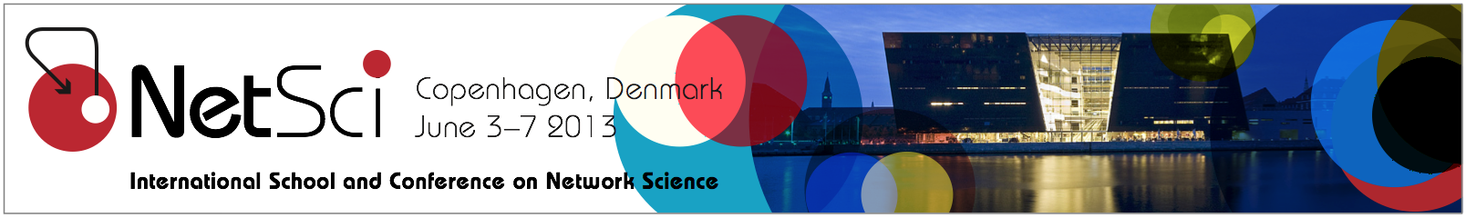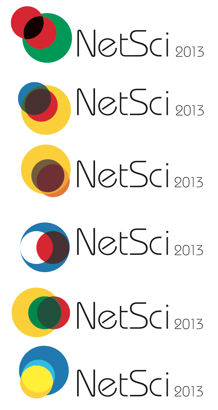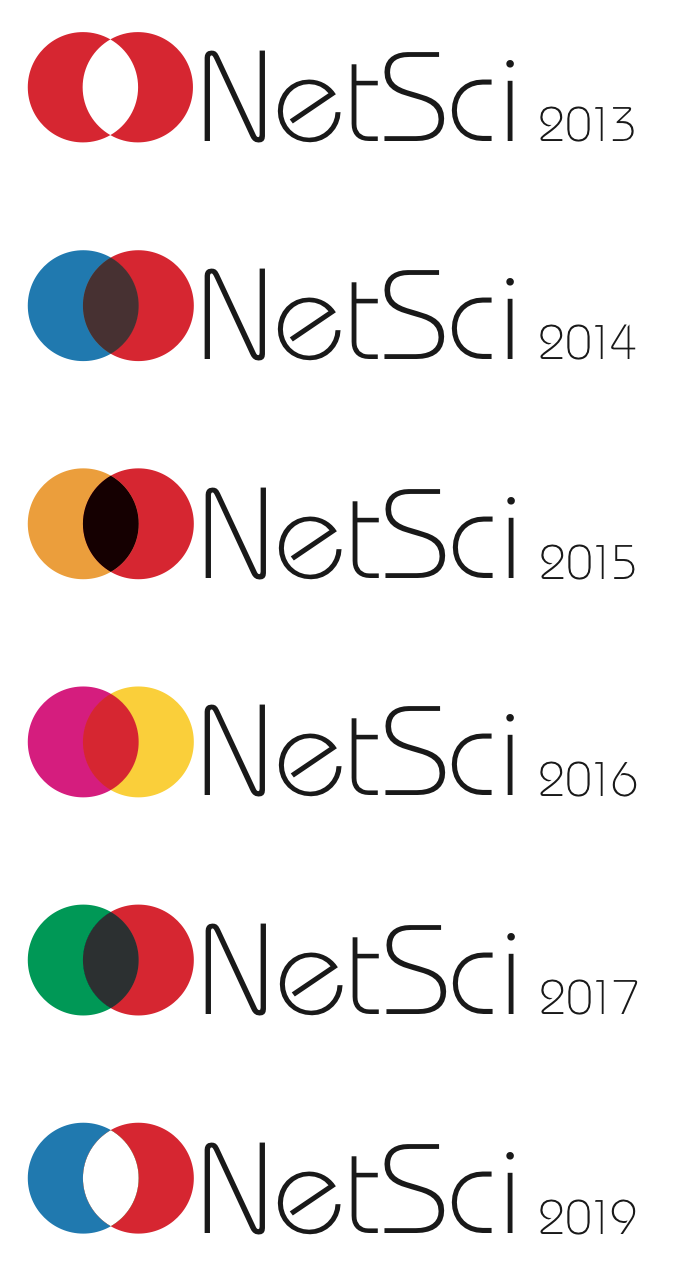 The web site banner shows the logo in addition to the dates, the image of the venue, and overlapping circles. The overlapping circles represent the several communities participating in the conference. It was inspired by the sketch tool devised by Sebastian Ahnert and presented at this year’s NetSci. The color palette for the circles reflects the colors of the country or region hosting the event. This year, the colors are those of Scandinavian flags, with the more obvious reference to Denmark. The palette should change every year accordingly.